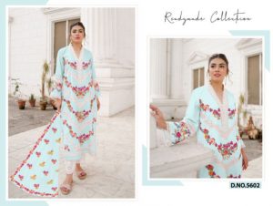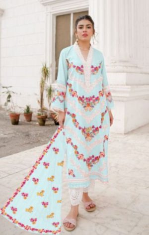 WEIGHT 1 KG PRODUCT NAME READYMADE COLLECTION D.NO.5602 SERIES PRICE ₹ 1299 TOP FABRIC MUSLIN EMBROIDERED BOTTOM / INNER FABRIC SOFT COTTON DUPATTA FABRIC HEAVY SILVER SHIFOON WITH DIGITAL PRINT COLOUR SKY BLUE SHIPPING EXTRA -