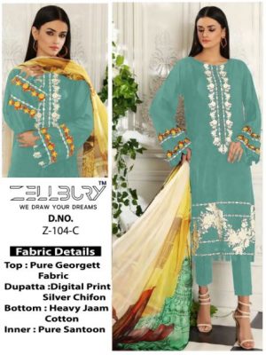 WEIGHT 1 KG PRODUCT NAME ZELLBURY HIT DESIGN Z-104-C SERIES PRICE ₹ 1349 TOP FABRIC PURE GEORGETTE FABRIC BOTTOM / INNER FABRIC HEAVY JAM COTTON / PURE SANTOON DUPATTA FABRIC SILVER SHIFFON COLOUR OPEL GREEN SHIPPING EXTRA -