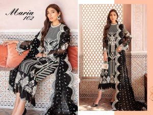 Product Name MARIYA 102 Weight 1.5 kg Price 1150 PUBLISHED ON Ready to Ship Top  Fox georgett with heavy embroidery Bottom  Santoon with embroidery petch Dupatta Georgett chiffon With Heavy Embroidery Colour Black and white Shipping Extra -