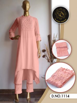Rated 0 out of 5₹1,499.00🔴 Description🔴 〰〰〰〰〰〰〰 ▪︎Intricate handwork yoke ▪︎Pleated frill collar ▪︎A-line pattern with high-low hemline ▪︎Slim fit pants with lace insert and frill detailing 🔴Details🔴 〰〰〰〰〰〰〰 ✨ Top:- foux with inner (santoon) ✨ Bottom :- jaam satin (100% cotten) ✨ Colour :- peach ‼ Size Chart‼ ✨ Top xxl size chest (44) ✨ Bottom xxl size (40-46) ✨Colour may slightly vary due to light effect✨ ✨ Dispatching ready✨Buy via WhatsApp