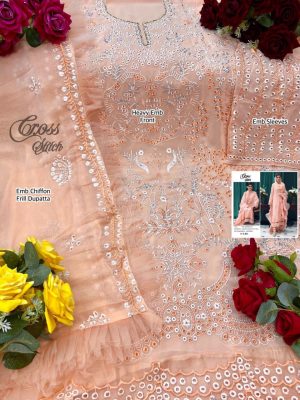 WEIGHT 1.2 Kg PRODUCT NAME CROSS STITCH DSG 801 PRICE ₹ 1,499 TOP FOX GEORGATTE WITH HEAVY EMBROIDERY WORK BOTTOM SANTOON DUPATTA NAZMEEN WITH HEAVY EMBROIDERY FLIRR DUPATTA INNER SANTOON COLOUR SALMON SHIPPING EXTRA -