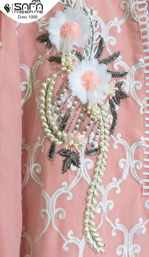 WEIGHT 1 KG PRODUCT NAME SAFA D.NO.1000 SERIES PRICE 1450/- TOP FABRIC PURE GEORGETTE (SIZE XL-42") BOTTOM FABRIC COTTON STRETCHABLE (SIZE XL 38") DUPATTA FABRIC DESIGNER BRAND SAFA FASHION HUB COLOUR PINK SHIPPING EXTRA -