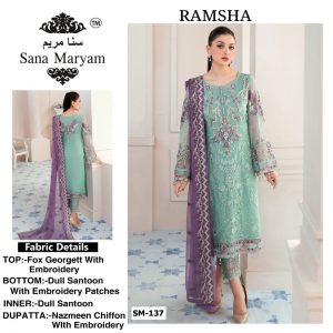 Rated 0 out of 5₹1,625.00Buy via WhatsAppSana Maryam Sm 137 Ramsha Pakistani Suits in Aqua Colour