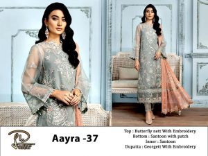 WEIGHT 1.2 Kg PRODUCT NAME LAIBA AM LD AAYRA 37 PRICE ₹ 1,548 TOP BUTTERFLY NETT WITH EMBROIDERY AND HAND ATTECH MOTI BOTTOM SANTOON WITH EMBROIDERY PATCHES DUPATTA GEORGETT CHIFFON WITH HEAVY EMBROIDERY COLOUR GREY SHIPPING EXTRA -