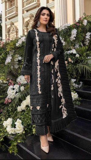 WEIGHT 1.2 KG PRODUCT NAME S-50-B SERIES PRICE ₹ 1,269 TOP FABRIC FOX GEORGETTE HEAVY EMBROIDERED BOTTOM / INNER FABRIC HEAVY SANTOON DUPATTA FABRIC NAZNEEN HEAVY EMBROIDERED WITH FRILL COLOUR BLACK SHIPPING EXTRA -