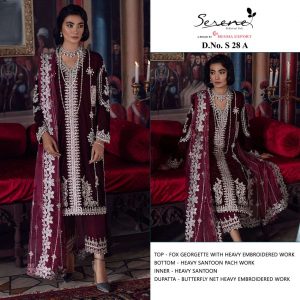 WEIGHT 1 KG PRODUCT NAME SERENE S-28-A SERIES PRICE ₹ 1,077 TOP FABRIC FAUX GEORGETTE EMBROIDERED BOTTOM / INNER FABRIC HEAVY SANTOON DUPATTA FABRIC BUTTERFLY NET HEAVY EMBROIDEREDE COLOUR MULBERRY SHIPPING EXTRA -