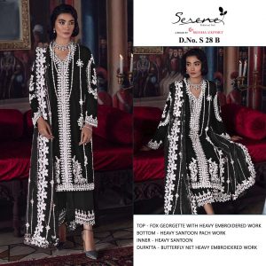 WEIGHT 1 KG PRODUCT NAME SERENE S-28-B SERIES PRICE ₹ 1,077 TOP FABRIC FAUX GEORGETTE EMBROIDERED BOTTOM / INNER FABRIC HEAVY SANTOON DUPATTA FABRIC BUTTERFLY NET HEAVY EMBROIDEREDE COLOUR BLACK SHIPPING EXTRA -
