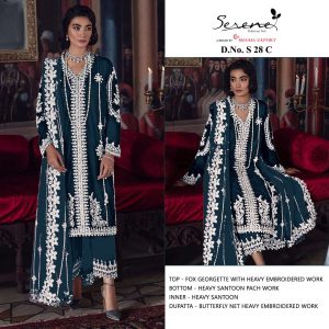 WEIGHT 1 KG PRODUCT NAME SERENE S-28-C SERIES PRICE ₹ 1,077 TOP FABRIC FAUX GEORGETTE EMBROIDERED BOTTOM / INNER FABRIC HEAVY SANTOON DUPATTA FABRIC BUTTERFLY NET HEAVY EMBROIDEREDE COLOUR TEAL SHIPPING EXTRA -