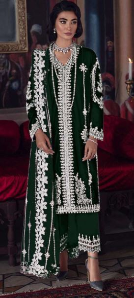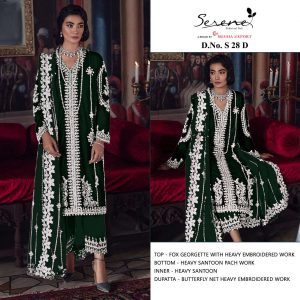WEIGHT 1 KG PRODUCT NAME SERENE S-28-D SERIES PRICE ₹ 1,077 TOP FABRIC FAUX GEORGETTE EMBROIDERED BOTTOM / INNER FABRIC HEAVY SANTOON DUPATTA FABRIC BUTTERFLY NET HEAVY EMBROIDEREDE COLOUR GREEN SHIPPING EXTRA -