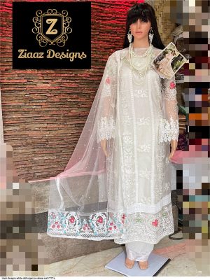 WEIGHT 1 KG PRODUCT NAME ZIAAZ HIT D.NO.7777-A PRICE ₹ 1349 TOP FABRIC ORGANZA PEARL WORK AND EMBROIDERED BOTTOM FABRIC COTTON DUPATTA FABRIC HEAVY NET EMBROIDERED COLOUR WHITE SHIPPING EXTRA -