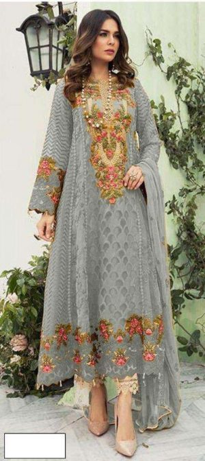 WEIGHT 1.2 KG CATALOG KILRUBA DESIGN K-56-E PRICE ₹ 1,099 TOP FABRIC GEORGETTE EMBROIDERED BOTTOM FABRIC SANTOON WITH PATCHWORK DUPATTA FABRIC FINE CHIFFON WITH HEAVY EMBROIDERY COLOUR GRAY SHIPPING EXTRA -