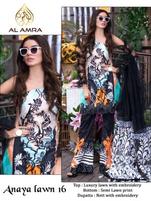 WEIGHT 1 KG PRODUCT NAME ANAYA LAWN 16 BY AL AMRA PRICE ₹ 1050 TOP FABRIC LUXURY LAWN EMBROIDERED BOTTOM FABRIC SEMI LAWN PRINT COLOUR FANCY SHIPPING EXTRA -