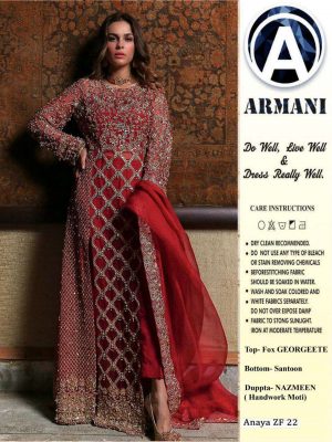 WEIGHT 1 KG PRODUCT NAME ANAYA ZF-22 BY ARMANI PRICE ₹ 1,350 TOP FABRIC FAUX GEORGETTE EMBROIDERED BOTTOM FABRIC SANTOON DUPATTA FABRIC NAZMEEN EMBROIDERED COLOUR MAROON SHIPPING EXTRA