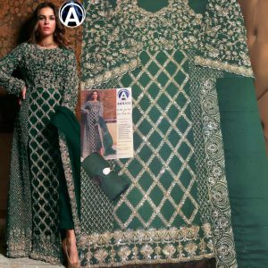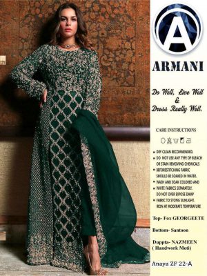 WEIGHT 1 KG PRODUCT NAME ANAYA ZF-22-A BY ARMANI PRICE ₹ 1,350 TOP FABRIC FAUX GEORGETTE EMBROIDERED BOTTOM FABRIC SANTOON DUPATTA FABRIC NAZMEEN EMBROIDERED COLOUR SACRAMENTO GREEN SHIPPING EXTRA -
