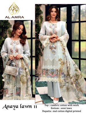 WEIGHT 1 KG PRODUCT NAME ANAYA ZF-11 BY AL AMRA PRICE ₹ 1,312 TOP FABRIC CAMBRIC COTTON WITH WORK BOTTOM FABRIC SEMI LAWN DUPATTA FABRIC MAL COTTON DIGITAL PRINTED COLOUR WHITE & GRAY SHIPPING EXTRA