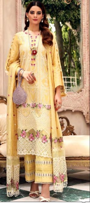 WEIGHT 1 KG CATALOG CROSS STITCH 2012-A BY KHAYYIRA PRICE ₹ 1,203 SIZE UNSTITCHED TOP FABRIC HEAVY GEORGETTE EMBROIDERED BOTTOM FABRIC HEAVY SANTOON DUPATTA FABRIC NAZNEEN EMBROIDERED COLOUR TROMBONE YELLOW SHIPPING EXTRA -