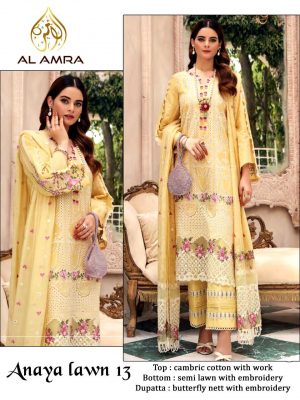 WEIGHT 1 KG PRODUCT NAME ANAYA ZF-13 BY AL AMRA PRICE ₹ 1,312 TOP FABRIC CAMBRIC COTTON WITH WORK BOTTOM FABRIC SEMI LAWN DUPATTA FABRIC BUTTERFLY NET EITH DIGITAL PRINTED COLOUR ROYAL YELLOW SHIPPING EXTRA -