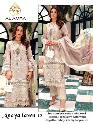 WEIGHT 1 KG PRODUCT NAME ANAYA ZF-12 BY AL AMRA PRICE ₹ 1,312 TOP FABRIC CAMBRIC COTTON WITH WORK BOTTOM FABRIC SEMI LAWN DUPATTA FABRIC TABBY SILK DIGITAL PRINTED COLOUR PEACH SHIPPING EXTRA -