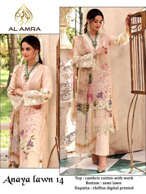 WEIGHT 1 KG PRODUCT NAME ANAYA ZF-14 BY AL AMRA PRICE ₹ 1,312 TOP FABRIC CAMBRIC COTTON WITH WORK BOTTOM FABRIC SEMI LAWN DUPATTA FABRIC CHIFFON DIGITAL PRINTED COLOUR CREAM SHIPPING EXTRA -