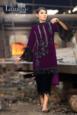 Designer Embroidery Velvet Tunic With beautiful Handwork , Flowers & Neck Pattern & Braso Fabric With Stylish Sleeves Pattern, paired with Strachable Pencil Pant.Weight 1. kg CATALOGUE Laxuria Trendz 1128 Purple Pcs 1 MOQ 1 Piece Top 9000 Velvet Bottom Cotton Strachable Top xl size  Top xl size chest (42) (XXL Margin Available) Catalogue Price ₹ 1350/ PUBLISHED ON Ready to Ship Bottom xl size Bottom xl size (36-42) ( L TO XXL FREE SIZE -