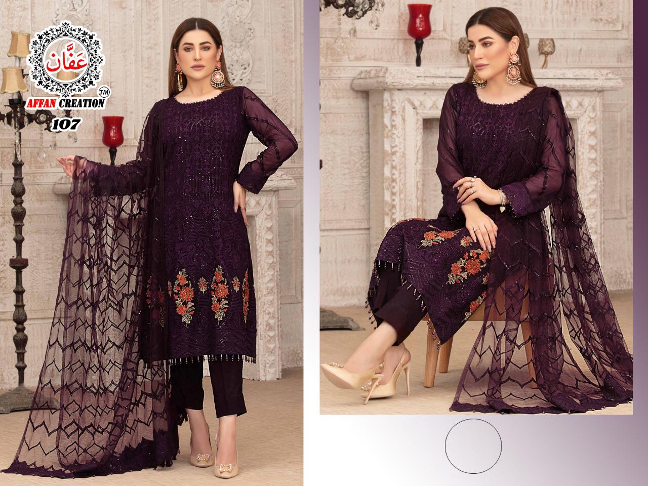 About this product: Affan Creation Present D.no.107 Pakistani Suits Beautiful Fancy Colorful Stylish Party Wear Dresses At Wholesale Price. The manufacturer is well known and the quality is pre-tested and checked. For Booking, you can Call or WhatsApp us on +91-90167 57806.