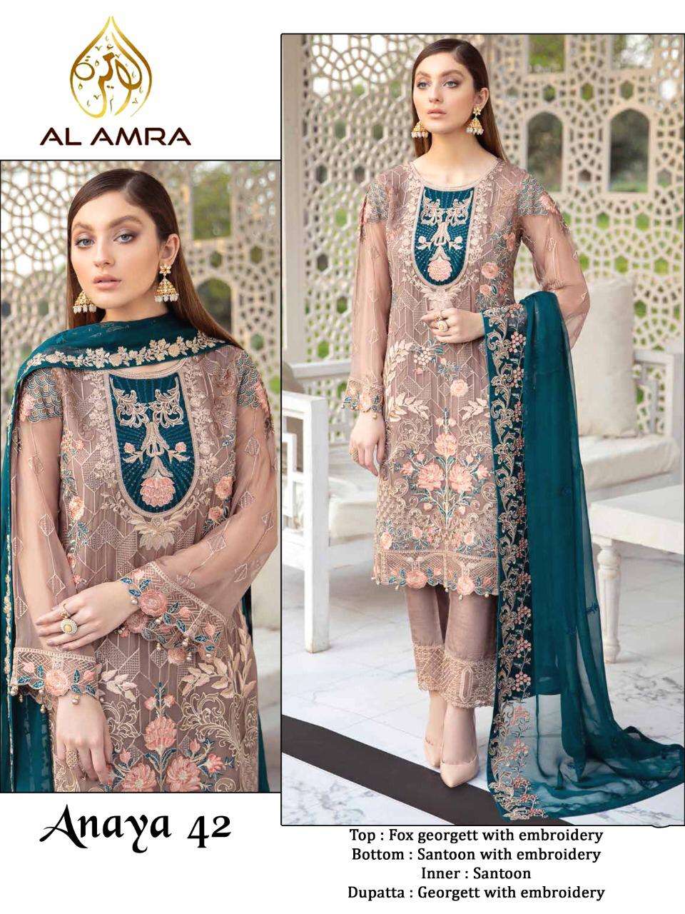 About this Product ; Al Amra Series Present Anaya 42 Pakistani Wear Dresses At Wholesale Price. The manufacturer is well known and the quality is pre-tested and checked.