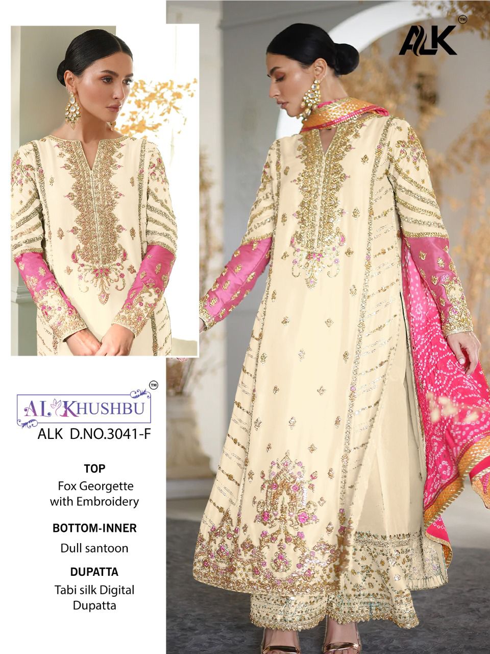 About this product: Al Khushbu Alk 3041 F Pakistani Suits in Beautiful Fancy Colorful Stylish Party Wear Dresses At Wholesale Price. The manufacturer is well known and the quality is pre-tested and checked. For Booking, you can Call or WhatsApp us on +91-90167 57806.