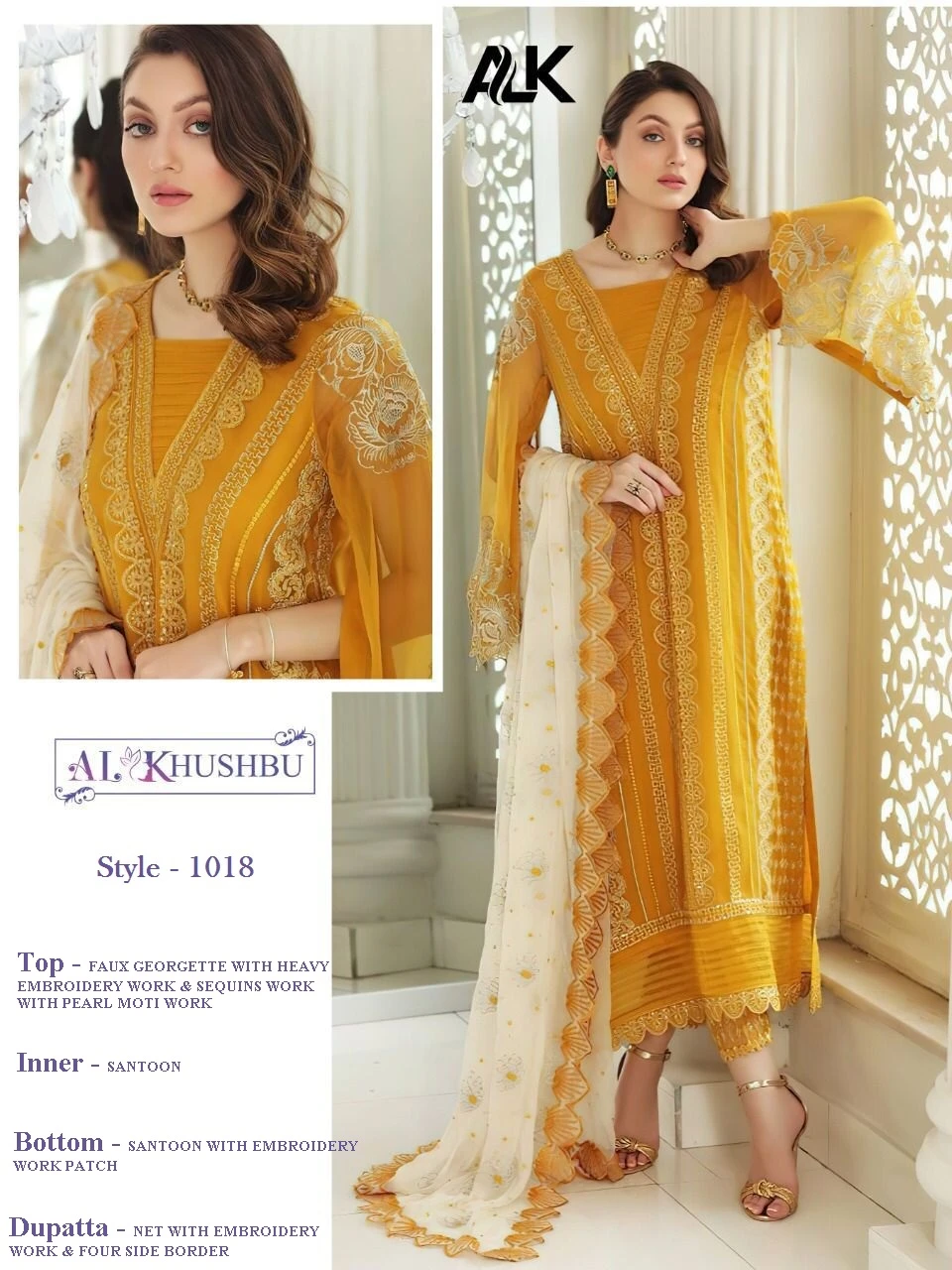 About this product: Al Khushbu Present ALK D.no.1018 Georgette Series Salwar Suit in Beautiful Fancy Colorful Stylish Party Wear Dresses At Wholesale Price. The manufacturer is well known and the quality is pre-tested and checked. For Booking, you can Call or WhatsApp us on +91-90167 57806.