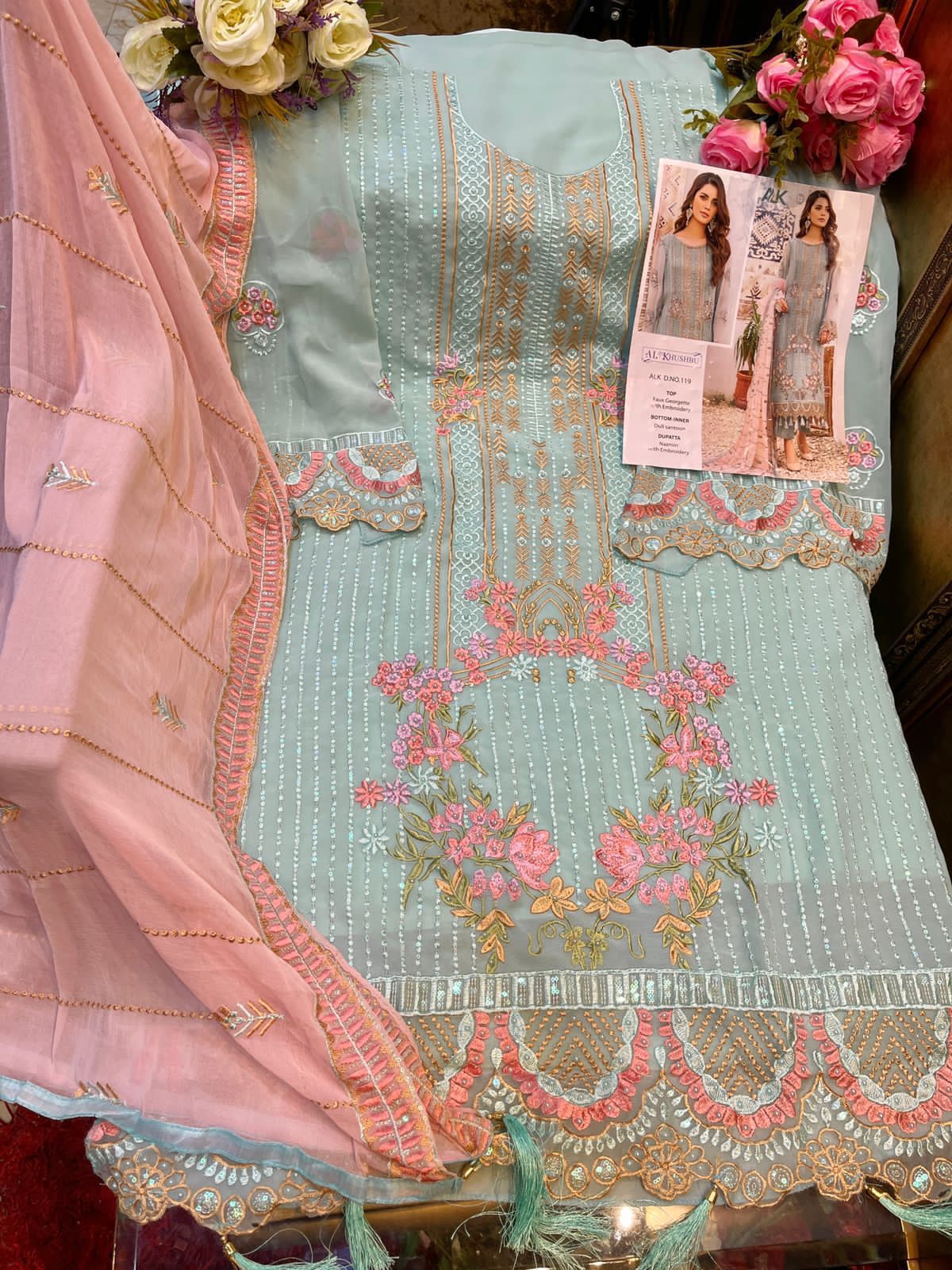 About this product: Al Khushbu Present ALK D.no.119 Series Suits in Beautiful Fancy Colorful Stylish Party Wear Dresses At Wholesale Price. The manufacturer is well known and the quality is pre-tested and checked. For Booking, you can Call or WhatsApp us on +91-90167 57806.