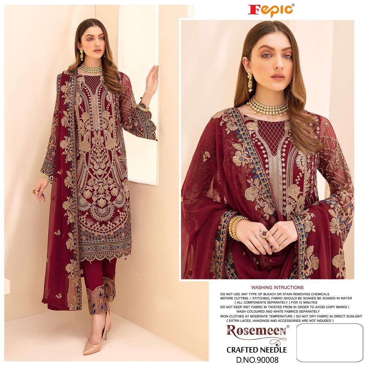 About this product: Fepic Present Rosemeen Crafted Needle D.No.10008 Series in Maroon Colour Pakistani Suits Beautiful Fancy Colorful Stylish Party Wear Dresses At Wholesale Price. The manufacturer is well known and the quality is pre-tested and checked.