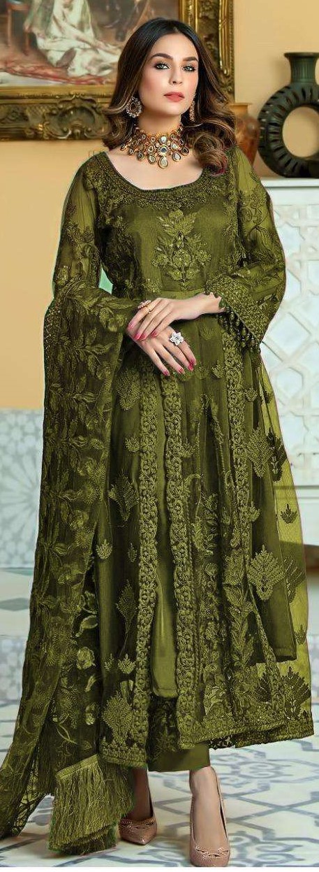 Home Dresses Original Indian Dress Firdous by Zarqash D.no.2039-C Series Net Salwar Suit in Army Green Colour
