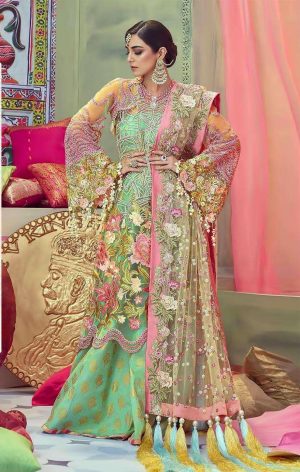 Maria.B. Lawn 1198 Pakistani Designer Hit Embroidered dress in Sky and Green Colour