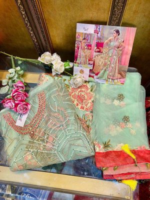 Be the first to review “Maria.B. Lawn 1203 Pakistani Designer Hit Embroidered dress in Green & White Colour” Cancel reply