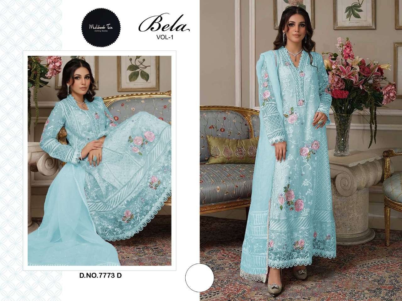 About this product: Mehboob Tex Present Bela Vol-1 D.no.7773-D Series Salwar Suit in Beautiful Fancy Colorful Stylish Party Wear Dresses At Wholesale Price. The manufacturer is well known and the quality is pre-tested and checked.