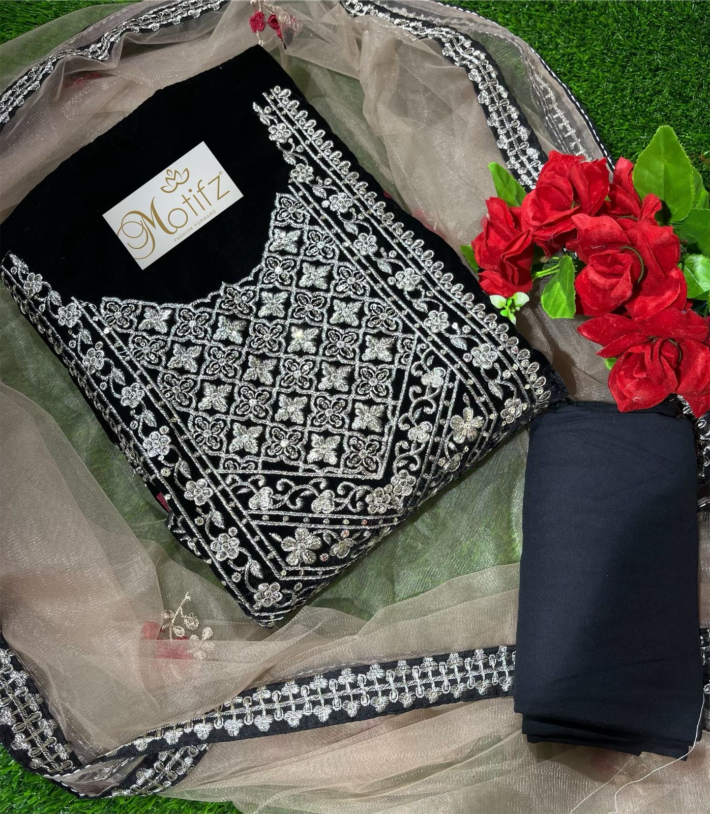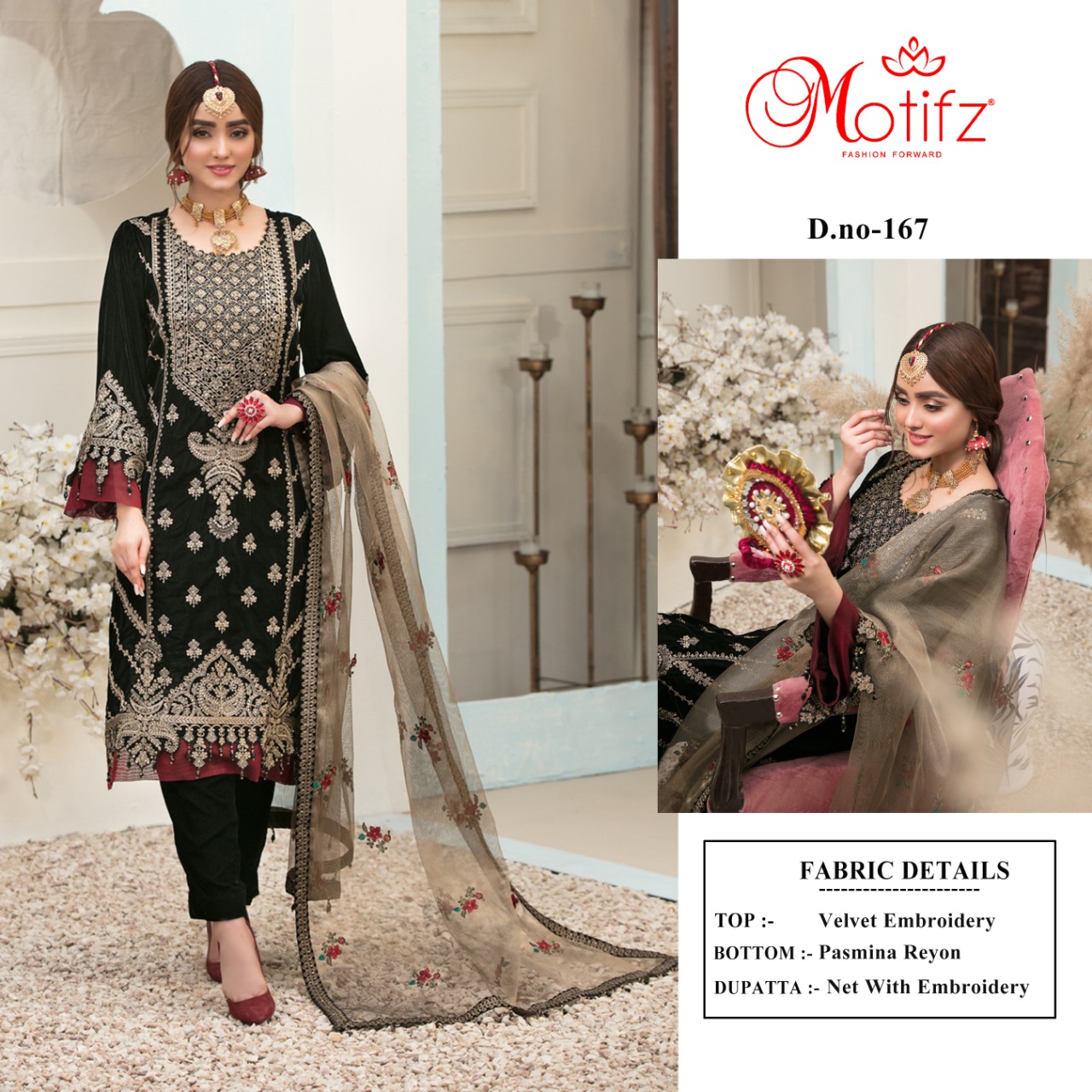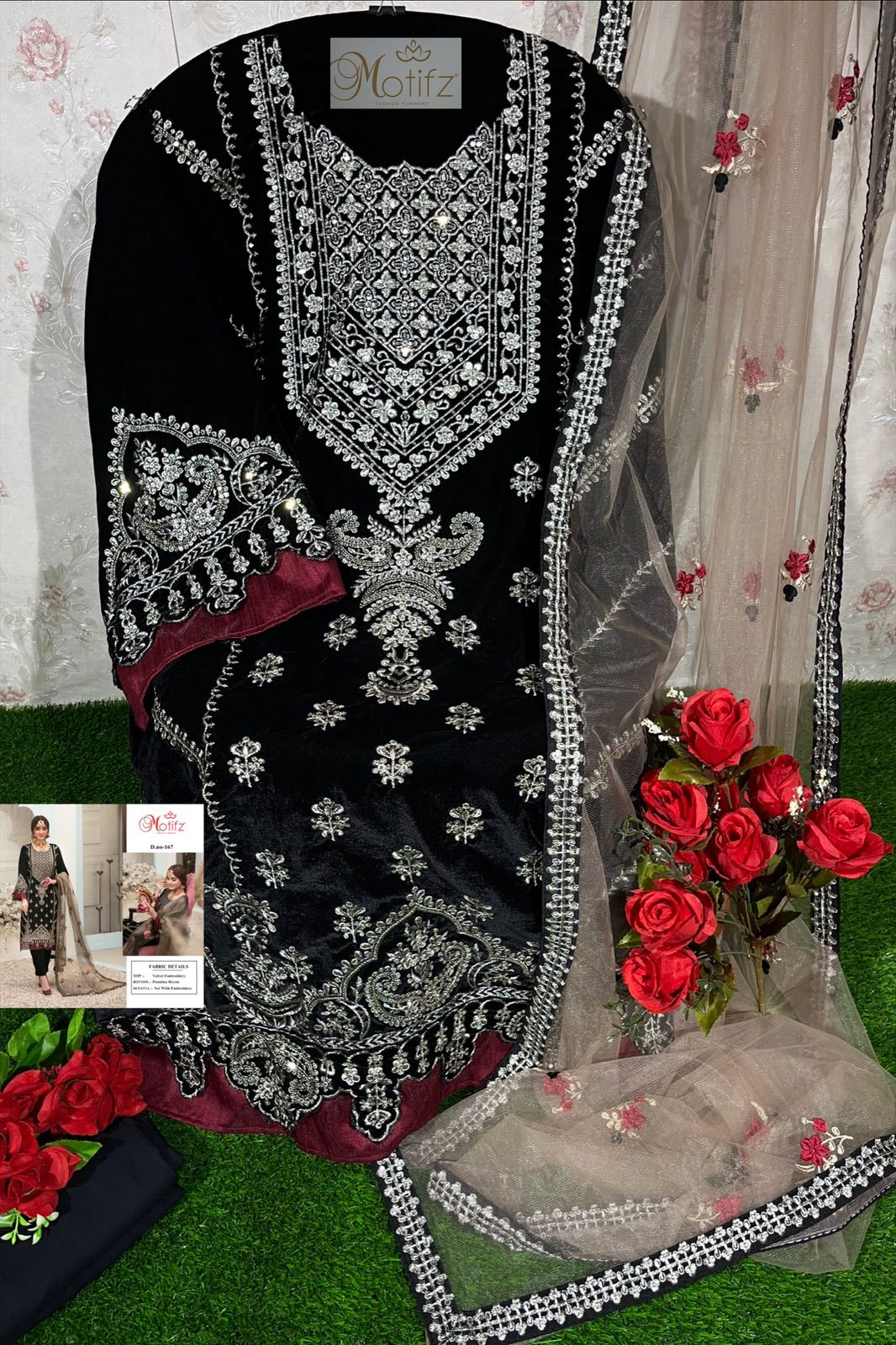 Motifz 167 Velvet Designer Pakistani Suits in Black Colour
