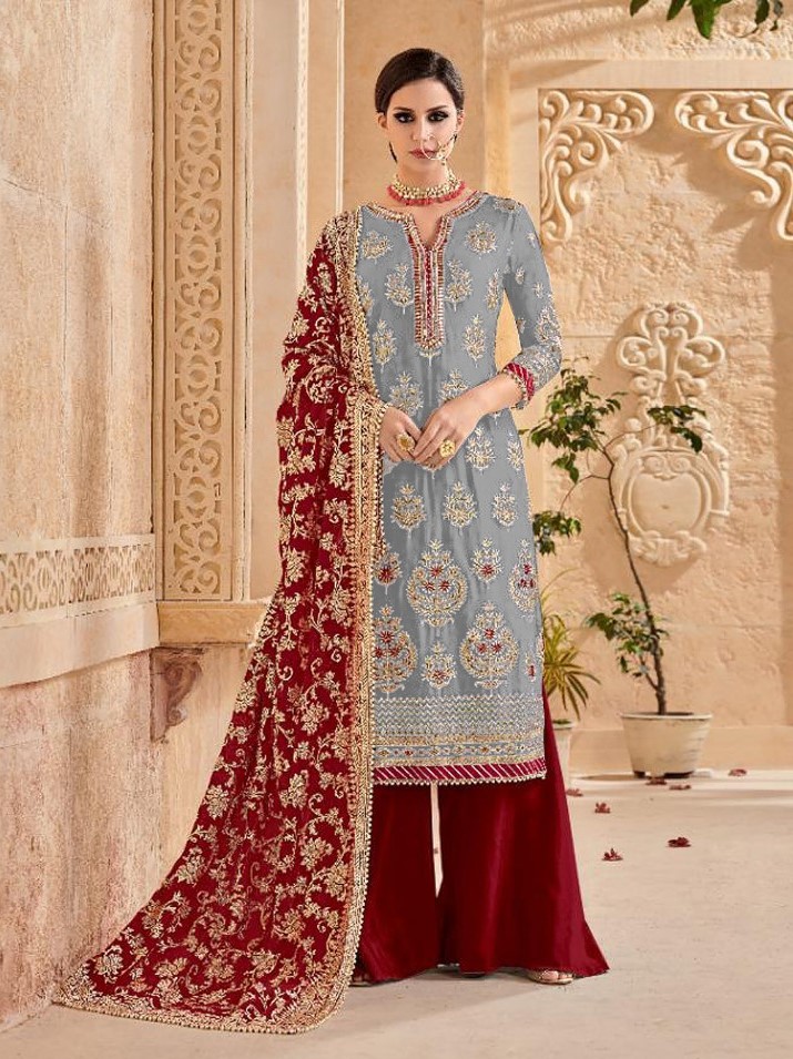Mutiyaar gold – 114-C, Grey and Red Heavy quality Georgette Embroidery With Heavy Work &lace