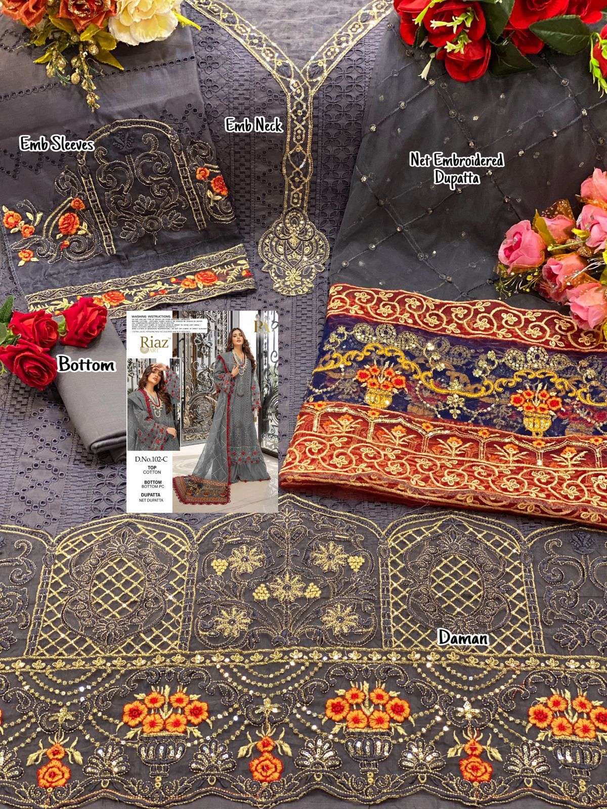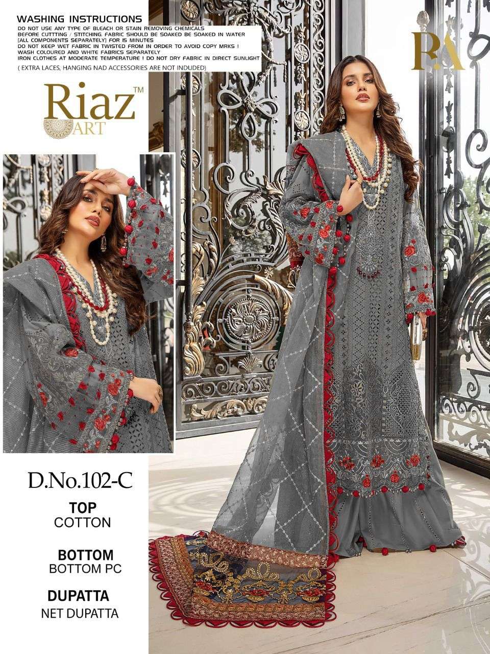 About this product: Riaz Art Present Riaz Art D.No.102-C Series Cotton Salwar Pakistani Suits Beautiful Fancy Colorful Stylish Party Wear & Occasional Wear Faux Georgette With Embroidery Dresses At Wholesale Price. The Manufacturer Is Well Known And The Quality Is Pre-tested And Checked.