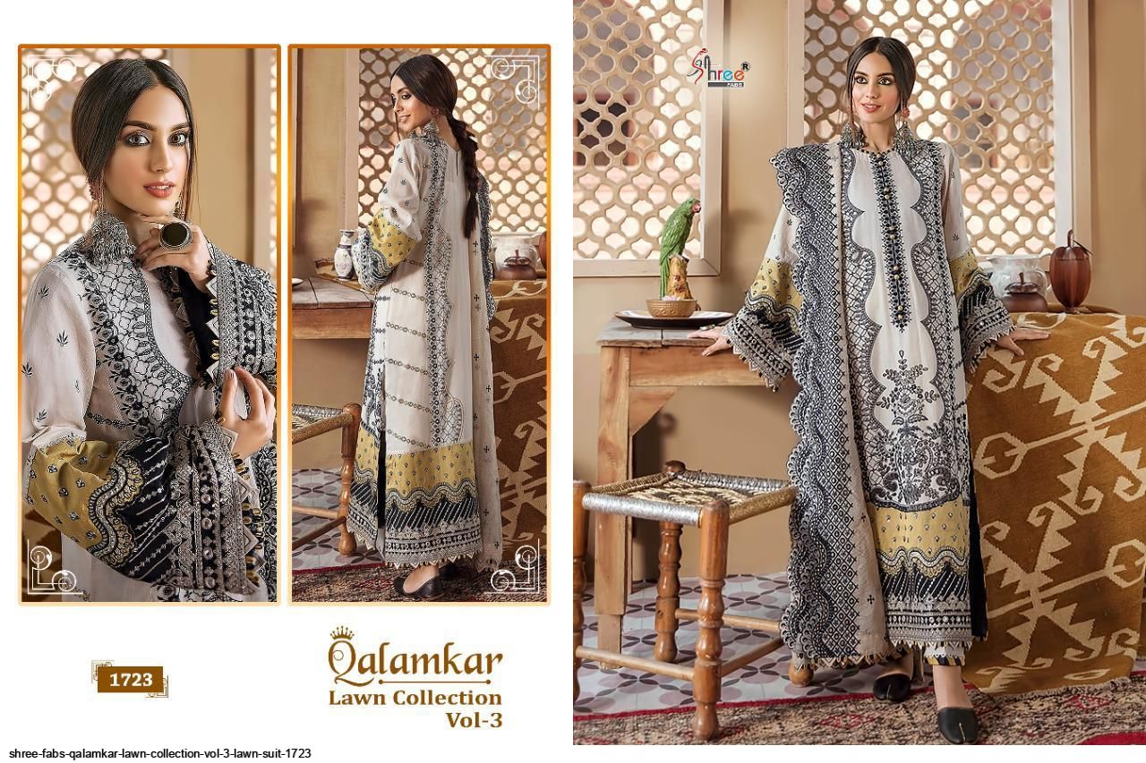 Shree Fabs Present Qalamkar Lawn Collection D.No.1723 Series Suit in White Colour