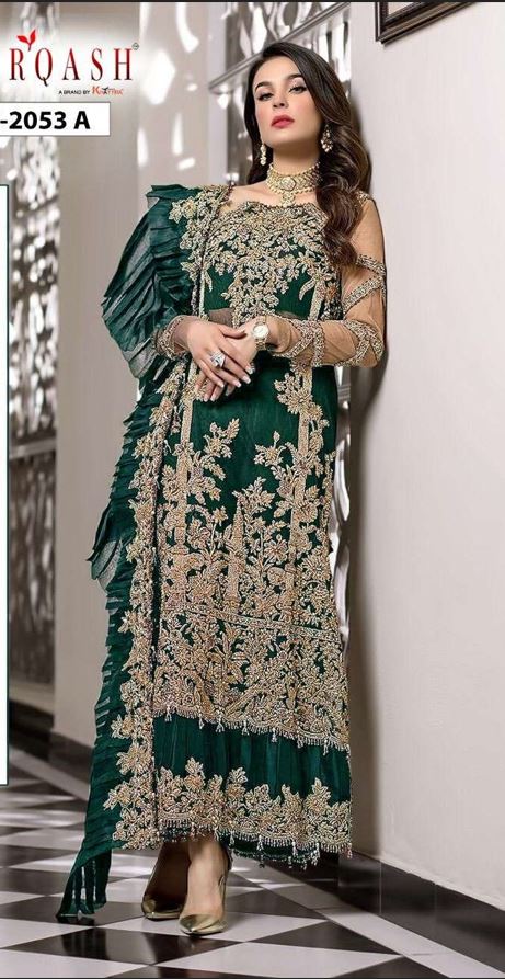 About this product: SRA by Zarqash 2053-A Salwar Suits in Dark Green Pakistani Suits Beautiful Fancy Colorful Stylish Party Wear Dresses At Wholesale Price. The manufacturer is well known and the quality is pre-tested and checked. For Booking, you can Call or WhatsApp us on +91-90167 57806.
