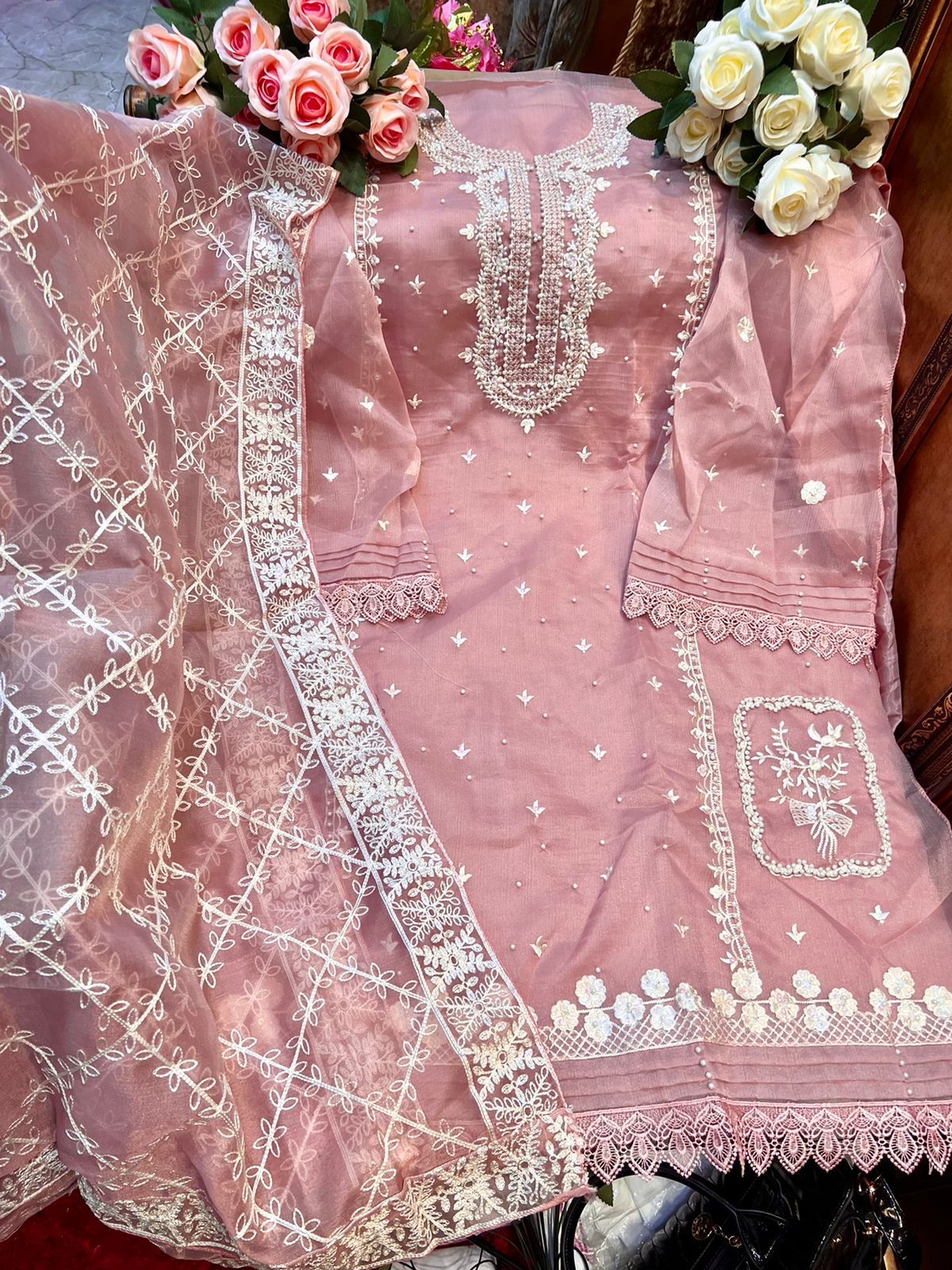 DETAILS | ORGANZA WITH HEAVY EMBROIDERY+MIRROR WORK+STONE WORK SANTOON INNER & BOTTOMS WITH EXTRA EMBROIDERY PATCH ORGANZA EMBROIDERED DUPATTA WITH STONE WORK |