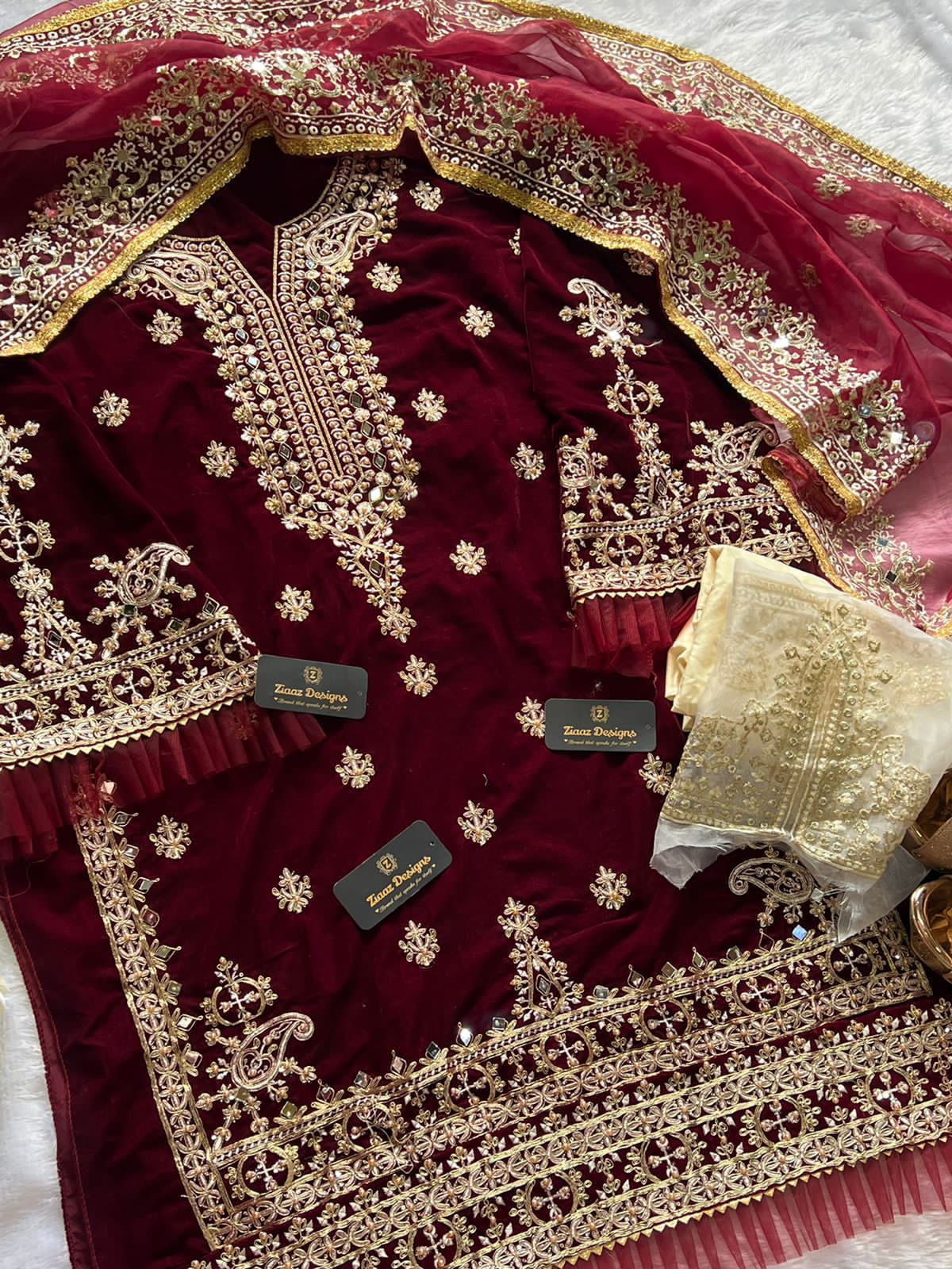 | DETAILS | VELVET SEMI STITCHED MIRROR WORK KAMEEZ WITH UNSTITCHED RAYON BOTTOMS WITH PATCH AND ORGANZA MIRROR WORK DUPATTA |