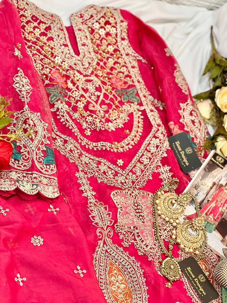 | Fabric Details | Organza Semi stitched Embroidered with velvet border on kameez Jacquard unstitched bottoms and chinon embroidered dupatta. |